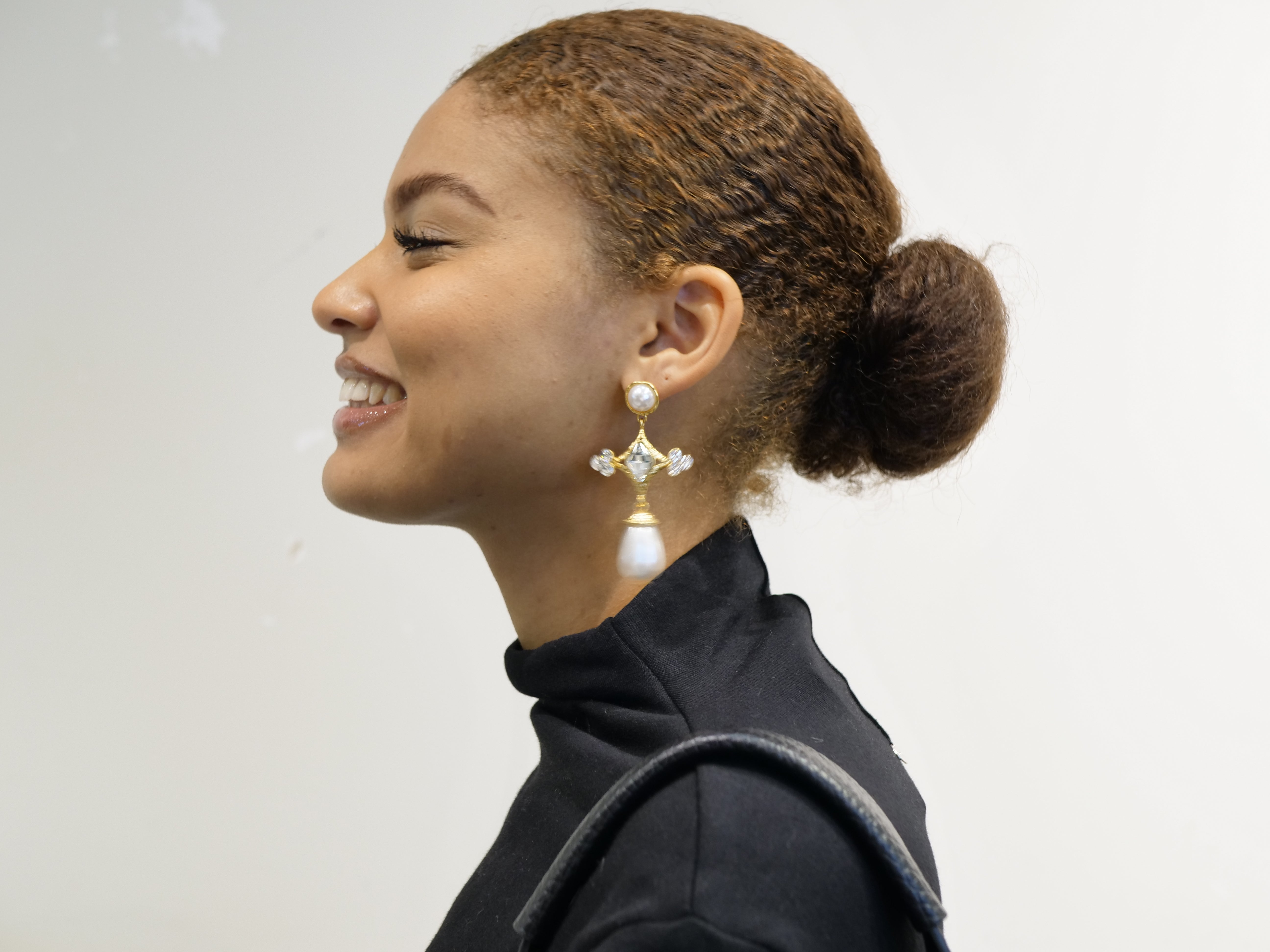 Channel modern regality with these stunning Gold-Tone Baroque Pearl and Cross Drop Earrings. A true statement piece, each earring begins with a lustrous round pearl stud that anchors an ornate, textured gold-tone cross. The center of the cross features a sparkling diamond-shaped crystal, flanked by trefoil rhinestone accents on the arms for maximum light-catching brilliance. Finished with a large, elegant teardrop pearl pendant that sways gently with movement, these earrings perfectly blend vintage religious iconography with contemporary high fashion. They are the ideal accessory to elevate a simple black turtleneck, complete a cocktail dress, or add drama to holiday attire.
