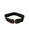 This black elastic belt combines style and flexibility with its bold double buckle design featuring gold-tone detailing. Made from 50% synthetic material and 50% elastane, it offers a secure and comfortable fit, making it ideal for cinching the waist of dresses or high-waisted outfits. The intricate gold detailing on the buckle adds a luxurious touch, making it both a statement piece and functional accessory. One size fits all.