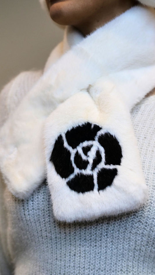 White Faux Fur Decorative Scarf with Black Rose Detail