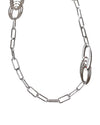 Striking and contemporary, this silver necklace features elongated interlinked oval and rectangular chain links. Its polished finish and sleek design exude modern elegance, making it a versatile accessory for both casual and formal occasions. A perfect statement piece to elevate any look.
