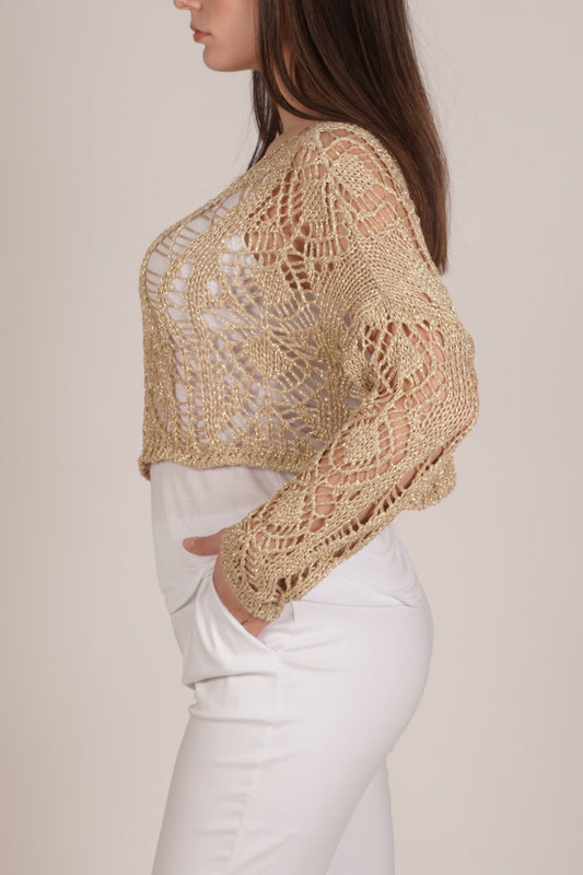 Gold Lurex Open-Knit Long Sleeve Sweater