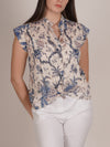 This midnight button-front sleeveless blouse showcases an elegant allover bird print, blending nature-inspired charm with effortless sophistication. Crafted from a lightweight, breathable fabric, it features delicate cap sleeves, a subtle mandarin collar, and a button-down front for a refined yet relaxed silhouette. The intricate bird and floral pattern in rich midnight hues adds a timeless touch, making it a versatile piece that pairs beautifully with tailored pants or casual denim.