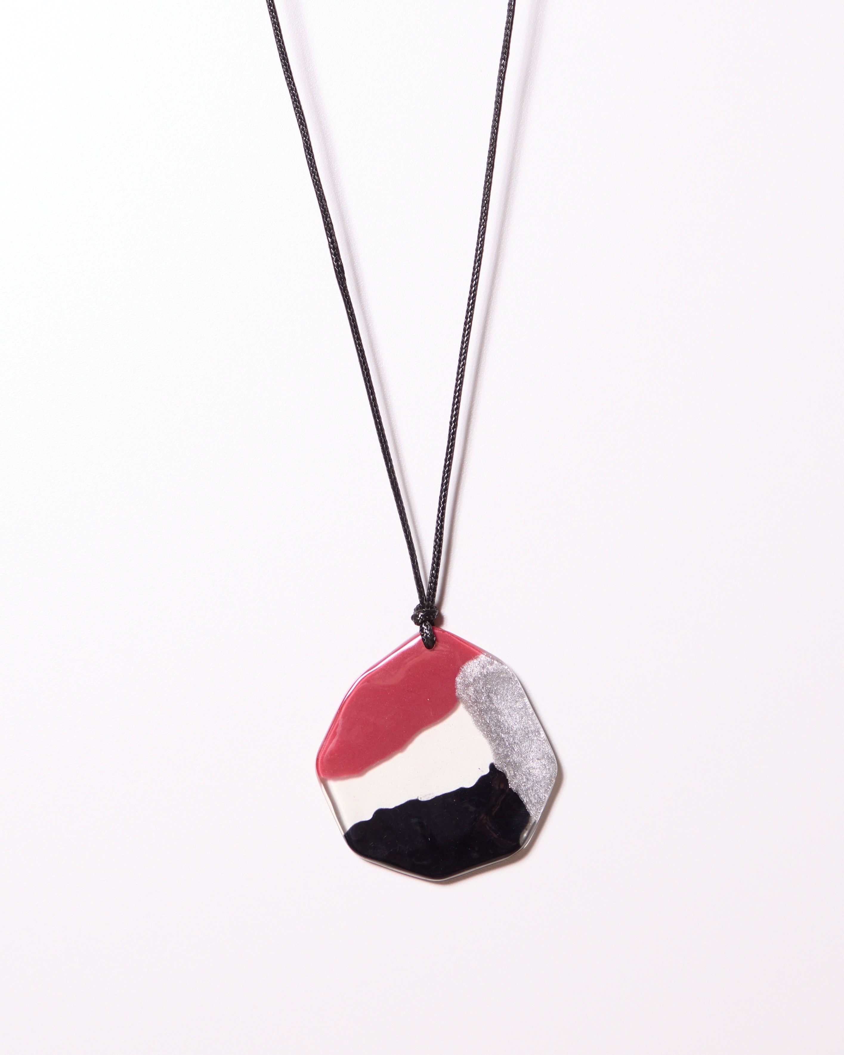 Bold and contemporary, this black, red, and silver abstract shaped cord necklace makes a striking statement. Its dynamic design and color contrast add modern flair, perfect for elevating both casual and evening outfits with artistic edge.