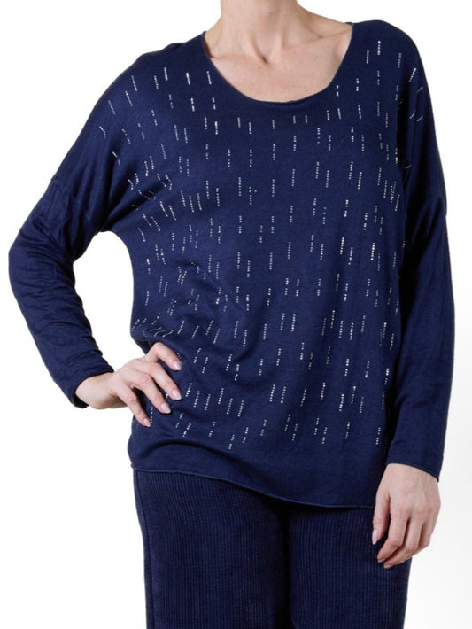Midnight Scoop Neck Drop Shoulder Tear Drop Rhinestone Long Sleeve