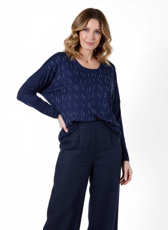 Midnight Scoop Neck Drop Shoulder Tear Drop Rhinestone Long Sleeve