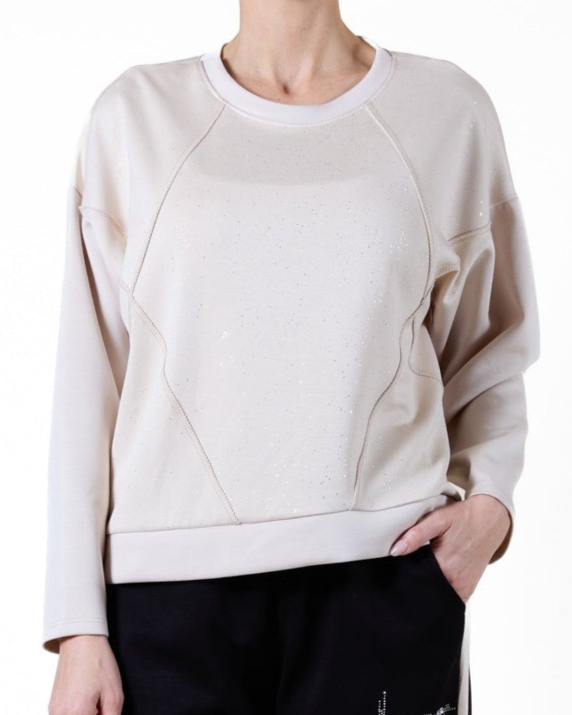 Pull-over butter à encolure ronde avec coutures extérieures, détails en flocons foil, et taille élastiquée pour une finition soignée.