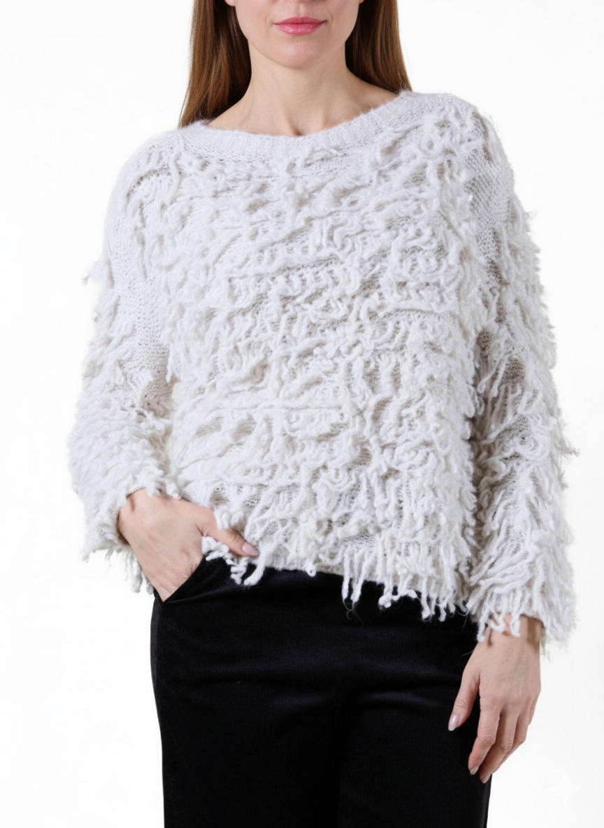 Chandail ivoire à col bateau, manches longues en tricot style tapis