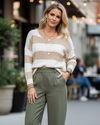 Restez confortable et élégant avec ce pull rayé à col en V et épaules tombantes en neige, présentant une combinaison luxueuse de lurex doré pour une touche d'éclat. Sa coupe décontractée le rend parfait pour le superposition par temps frais.