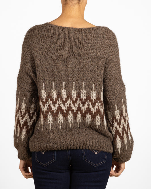 Pull à Col V avec Épaules Tombantes et Motif Zigzag Multicolore au Centre